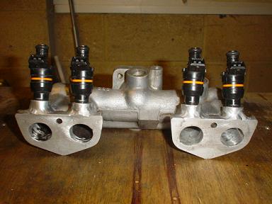 Manifold This manifold is from an American spec Midget 1500 using a 1.5" Stromberg. It is ideal for my purposes as it perfect for mounting a single throttle body. At 38mm the inlet is somewhat small but can be opened up quite a bit to fit the 55mm throttle body to be fitted. The injectors will be fitted into the manifold as close to the head as possible so that the fuel can be squirted direct into the ports on top of the valve heads. This should maximise the low speed throttle response. |
